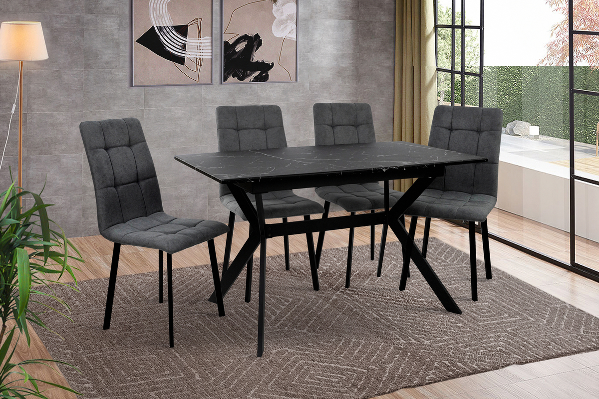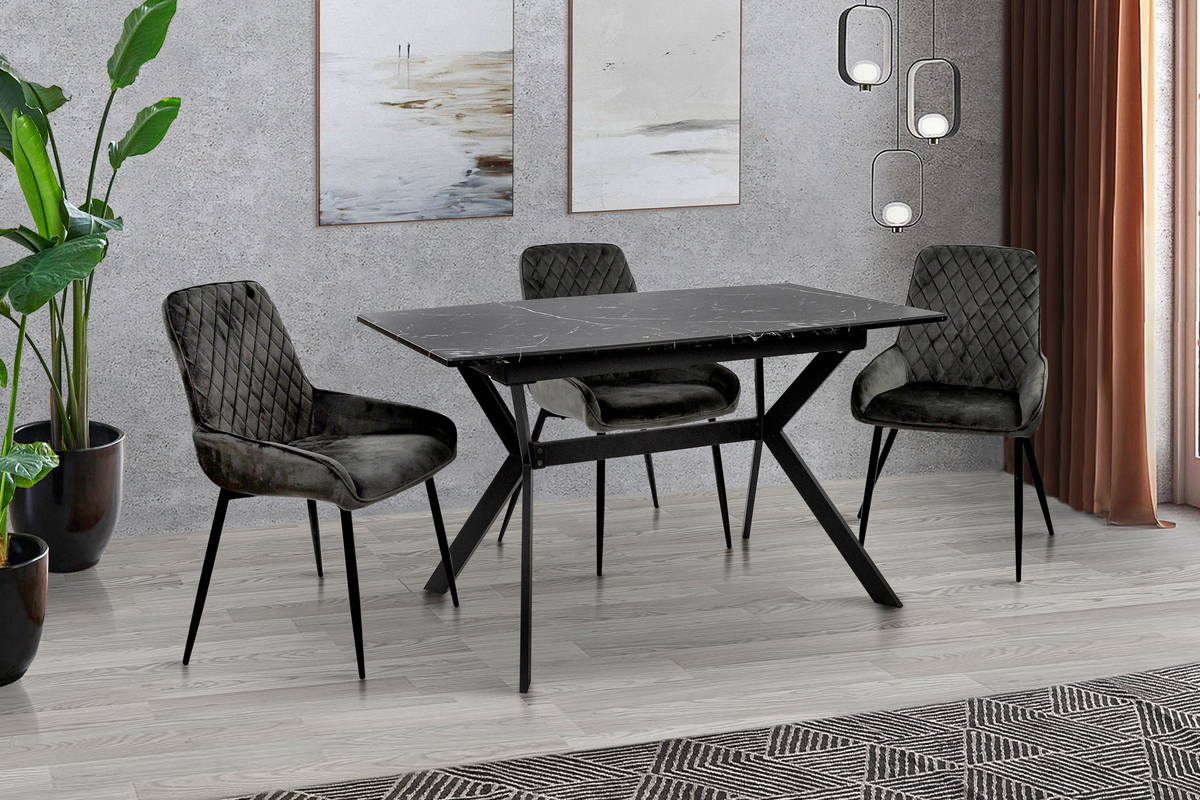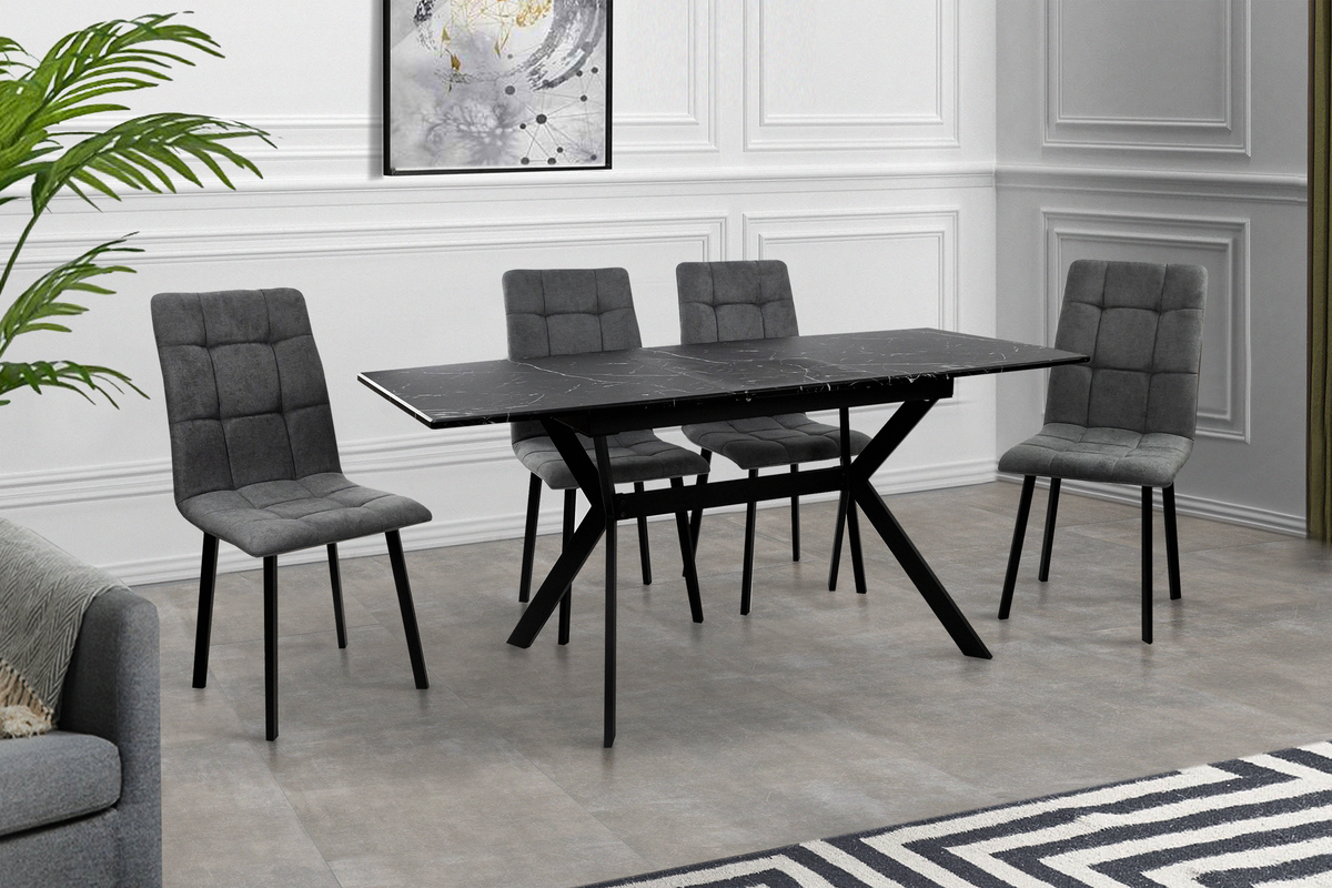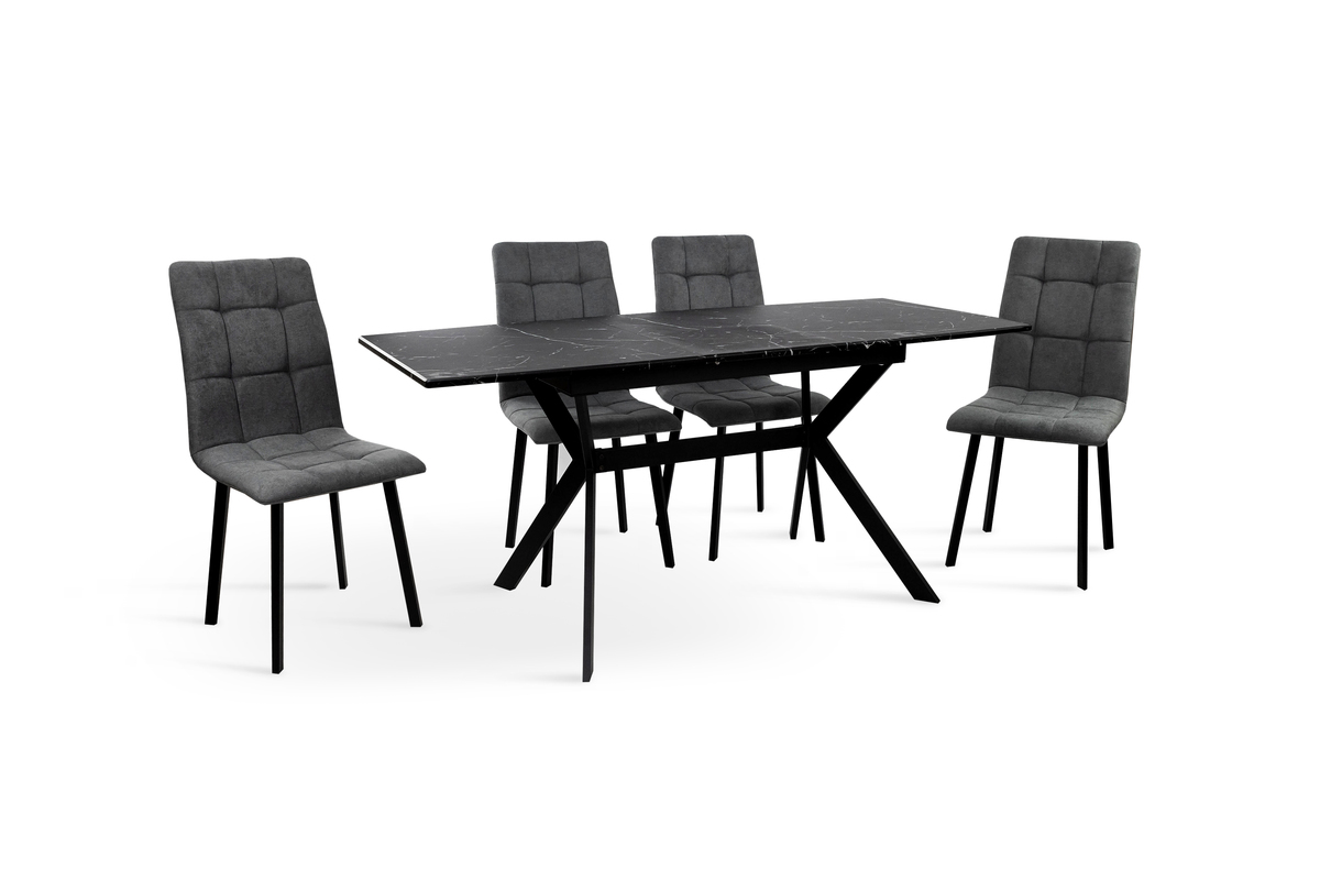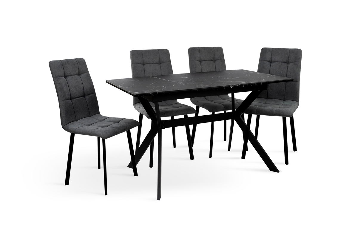 Размер: 1300(+400)*770. Цвет: Каркас и ножки: черный; Столешня: Мрамор темный. Материал: Каркас и ножки: Металл; МДФ в ПВХ пленке. Вкладка в стол с механизмом "бабочка". Толщина столешняя: 20 мм. Каркас и ножки: порошковая покраска