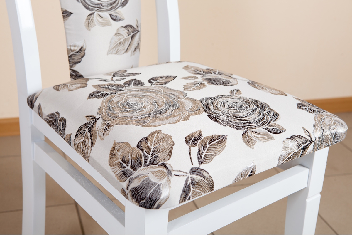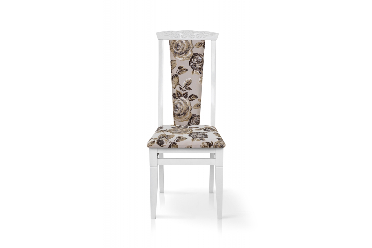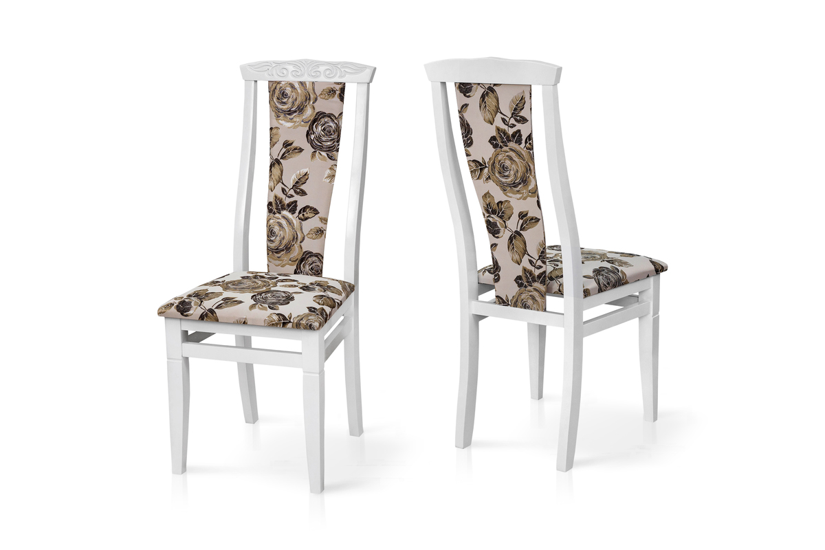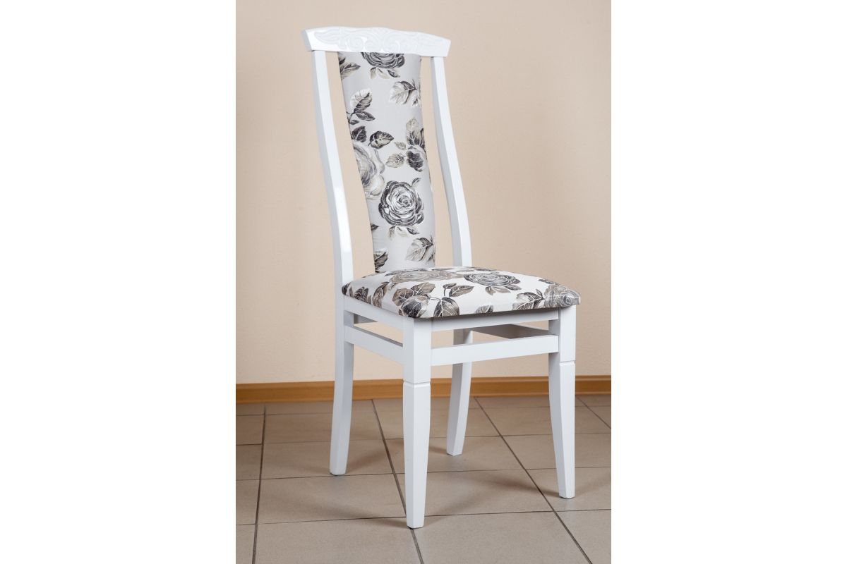 Розмір: В: 1030 мм; Г: 440 мм; Ш: 430 мм. Колір: Білий Матеріал: Каркас: Масив бука; Тканина: Рози 2А, МебТекс.Красивий, добротний та стильний стілець «Чумак-2» вирізняється гарною різьбленою спинкою, високою якістю виготовлення та комфорту. Найкраще співвідношення ціни та якості. Виготовлений з масиву бука. Габаритні розміри стільця «Чумак» 2 ідеально підходять під стандарти всієї колекції меблів «Карпати».
