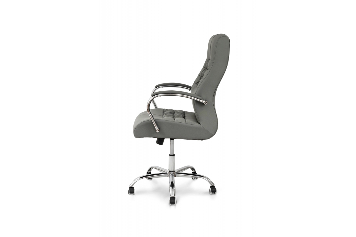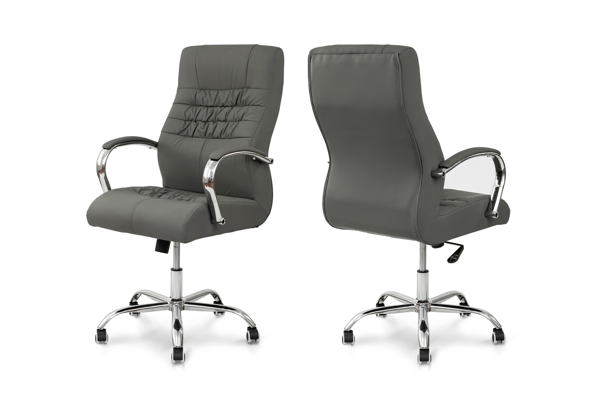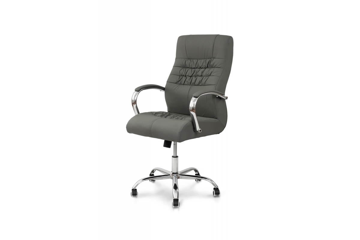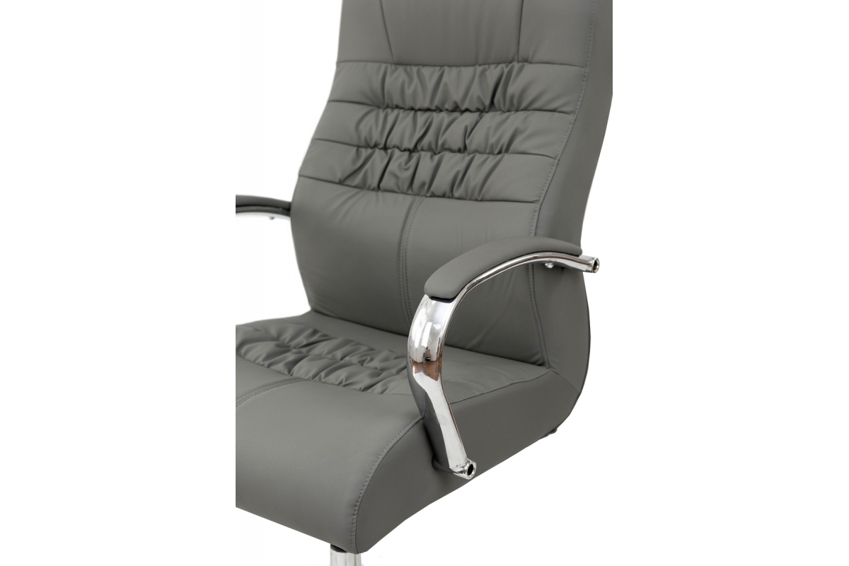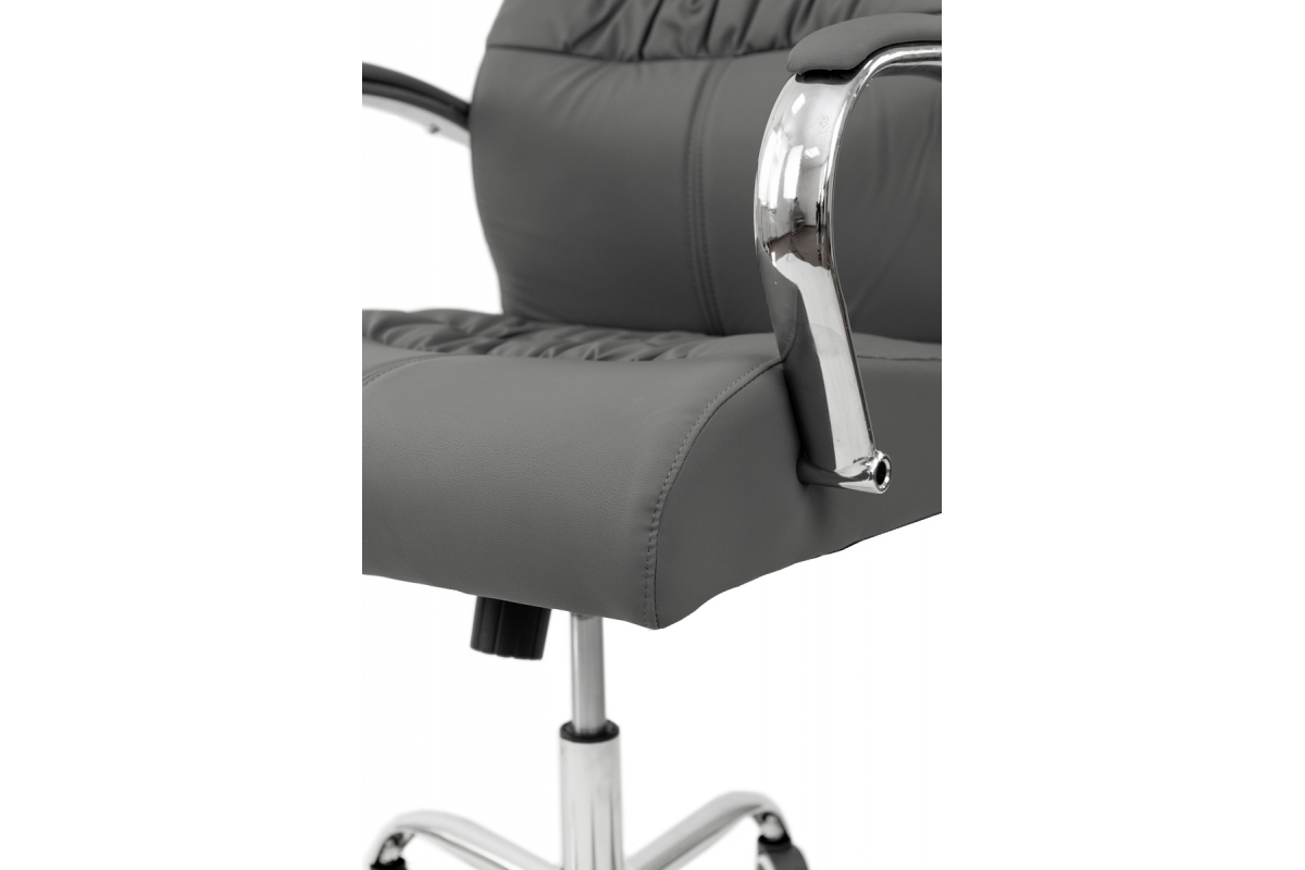 Розмір: Висота стільця (нижнє положення): 110 см; Сидіння: Ш - 51 см, Г: 48 см; Спинка: В - 66 см; Висота підлокітників: 20 см; Висота підйому механізму: 10 см; Ширина виробу: 60 см; Глибина виробу: 60 см; Колір: Каркас: Хром; Сидіння: Сірий, Оббивка: шкірзам Матеріал: Каркас: Метал; Сидіння: Фанера гнутоклеєна Ніжки - метал, хром Підйомний механізм - газліфт