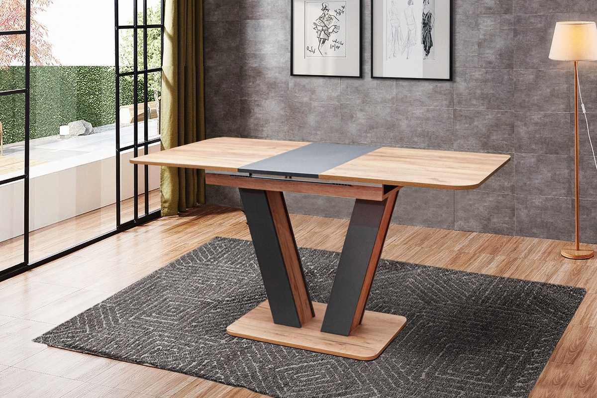 Розмір: 1100(+350)*680. H: 765. Колір: Каркас: ДСП SWISSPAN Дуб Крафт золотий/Сірий графіт; Столешня: Золотий+Вкладка графіт Матеріал: ДСП ламіноване.