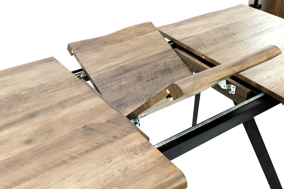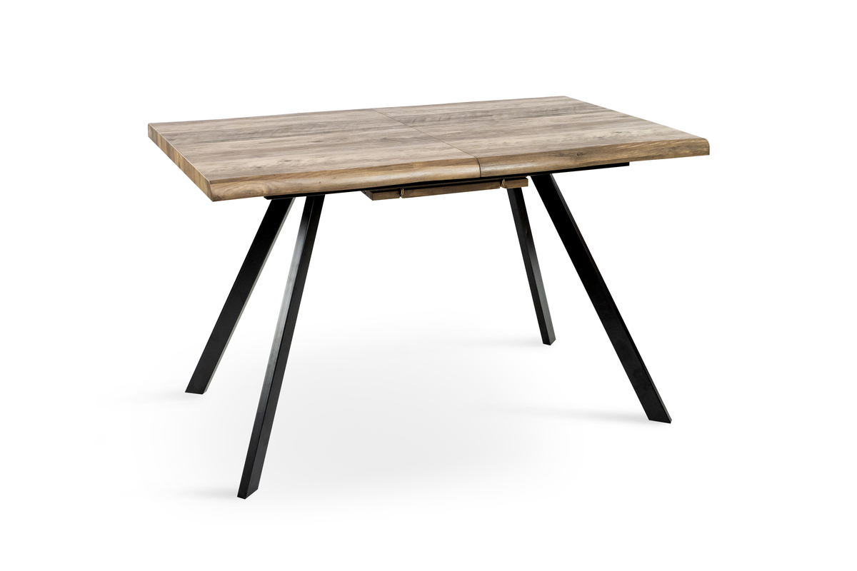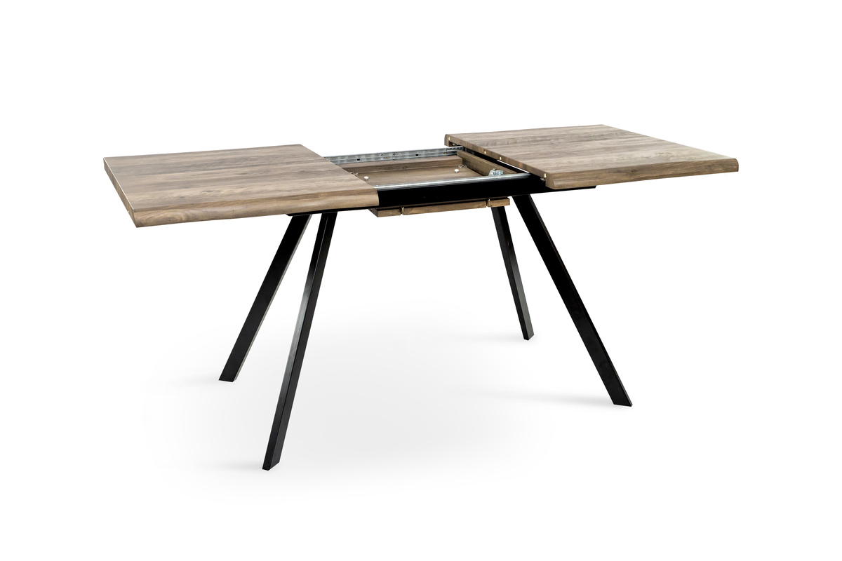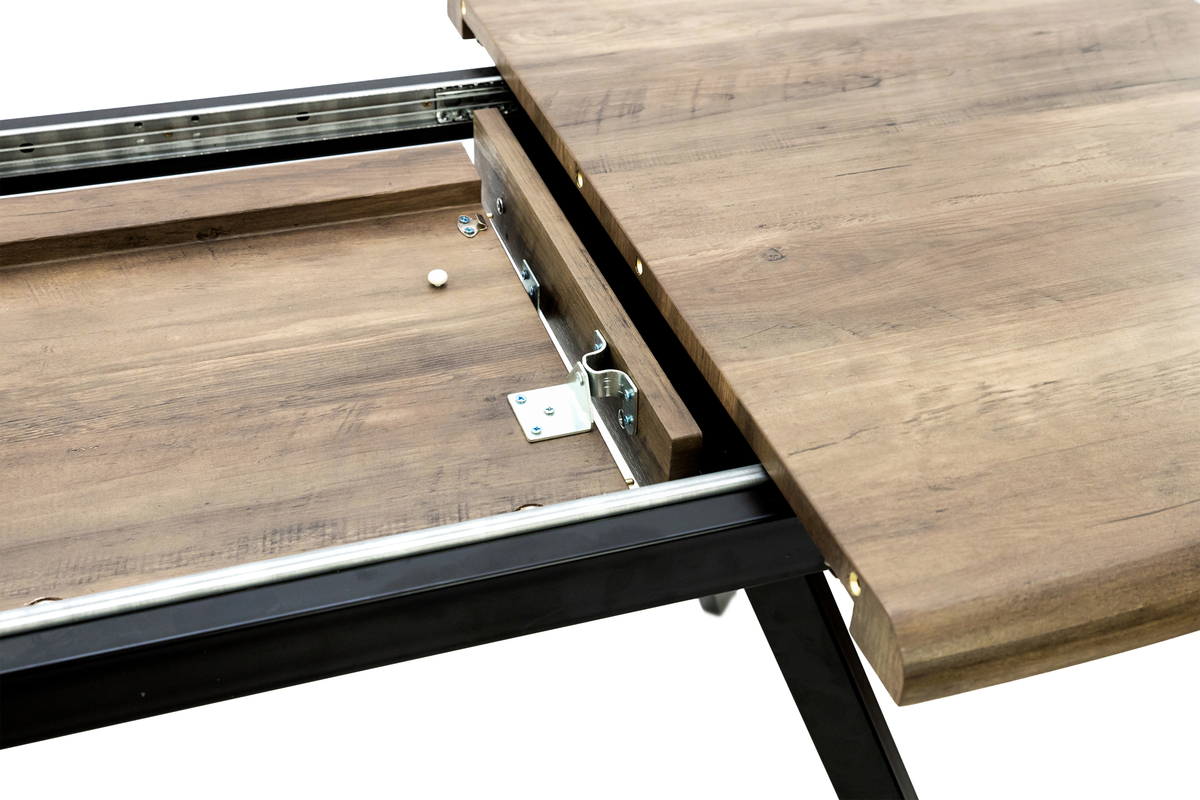Розмір: 120*(+40)*80 см, H - 76 см; Розкладний: Форма прямокутника з ефектом криволінійної дошки; Колір: під натуральну деревину, ніжки - чорний. Матеріал: МДФ 38 мм товщиною, тонкий шар матеріалу з ефектом деревини (каширований цільнорулоний папір) Ніжки: метал порошкова покраска, колір чорний, товщина 40*80мм