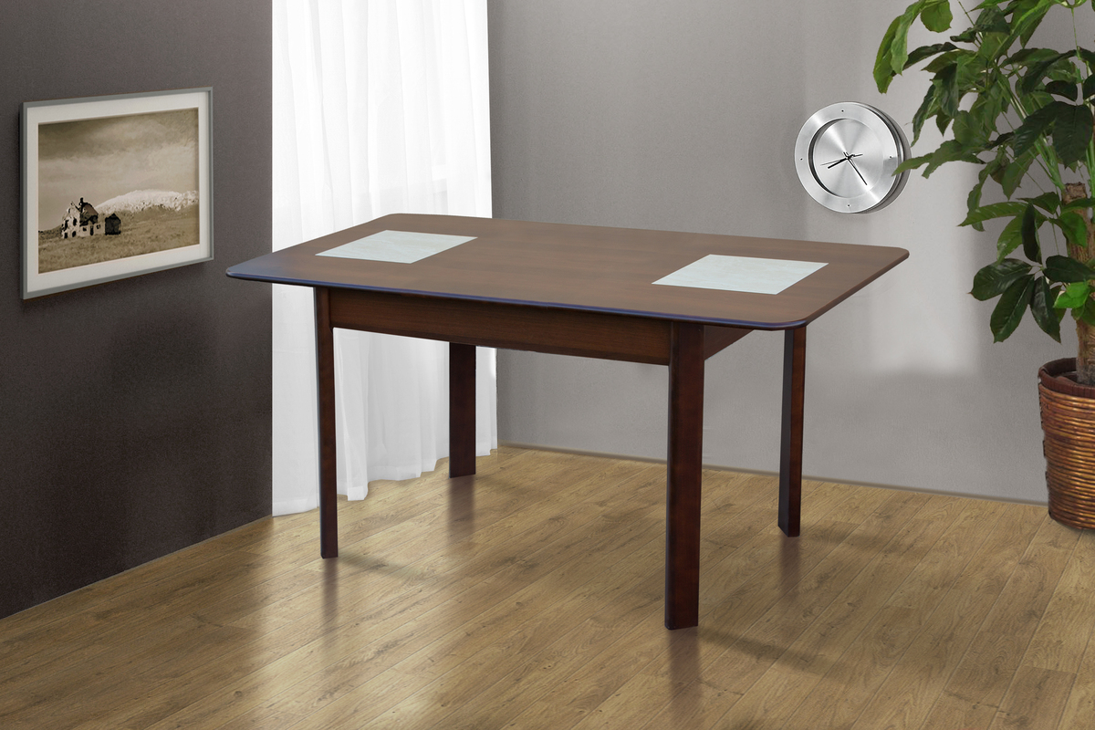 Розмір: 1150(+390)*740 Колір: Каркас: темн горіх; Столешня:темн горіх, кераміка - бежевий. Матеріал: Каркас: масив клена; столешня: МДФ зі штучним шпоном + вставка кераміка. Стіл обідній Бостон досить компактний і добре впишеться в невеликій кухні. Прямокутна стільниця столу з заокругленими краями виготовлена із плити МДФ, яка покрита штучним шпоном і декорована двома вставками з кераміки. Ніжки столу прямі, прямокутної форми, без гострих кутів, виготовлені з натурального дерева.