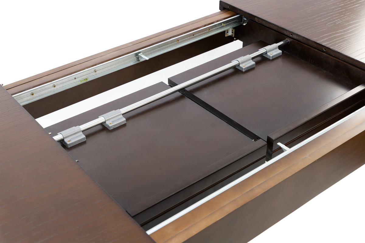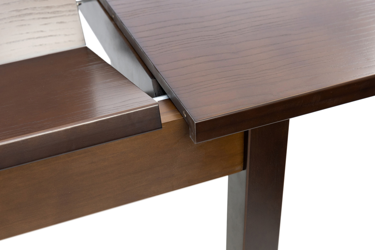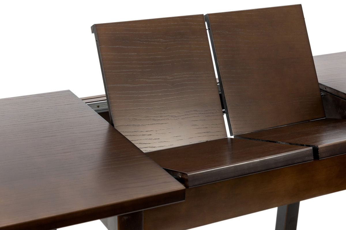 Розмір: 1200(+400 +400)*800; Колір: Каркас: темн горіх; Столешня: темн.горіх. Матеріал: Каркас: Масив Бука; Столешня: МДФ шпонований ясенем. Товщина столешні: 19 мм, з фальш панеллю по краям 38 мм. Вкладка: 2 вкладки бабочки.