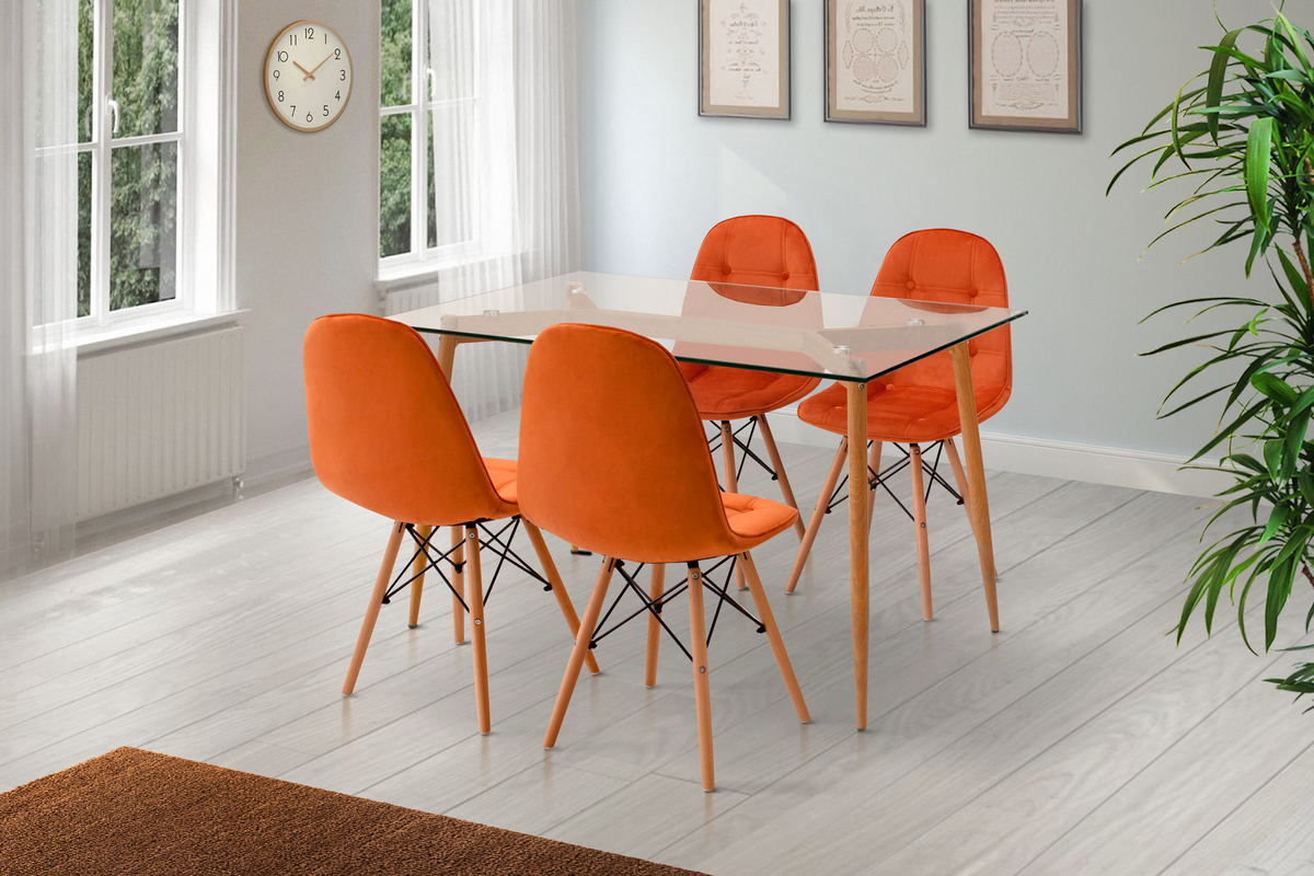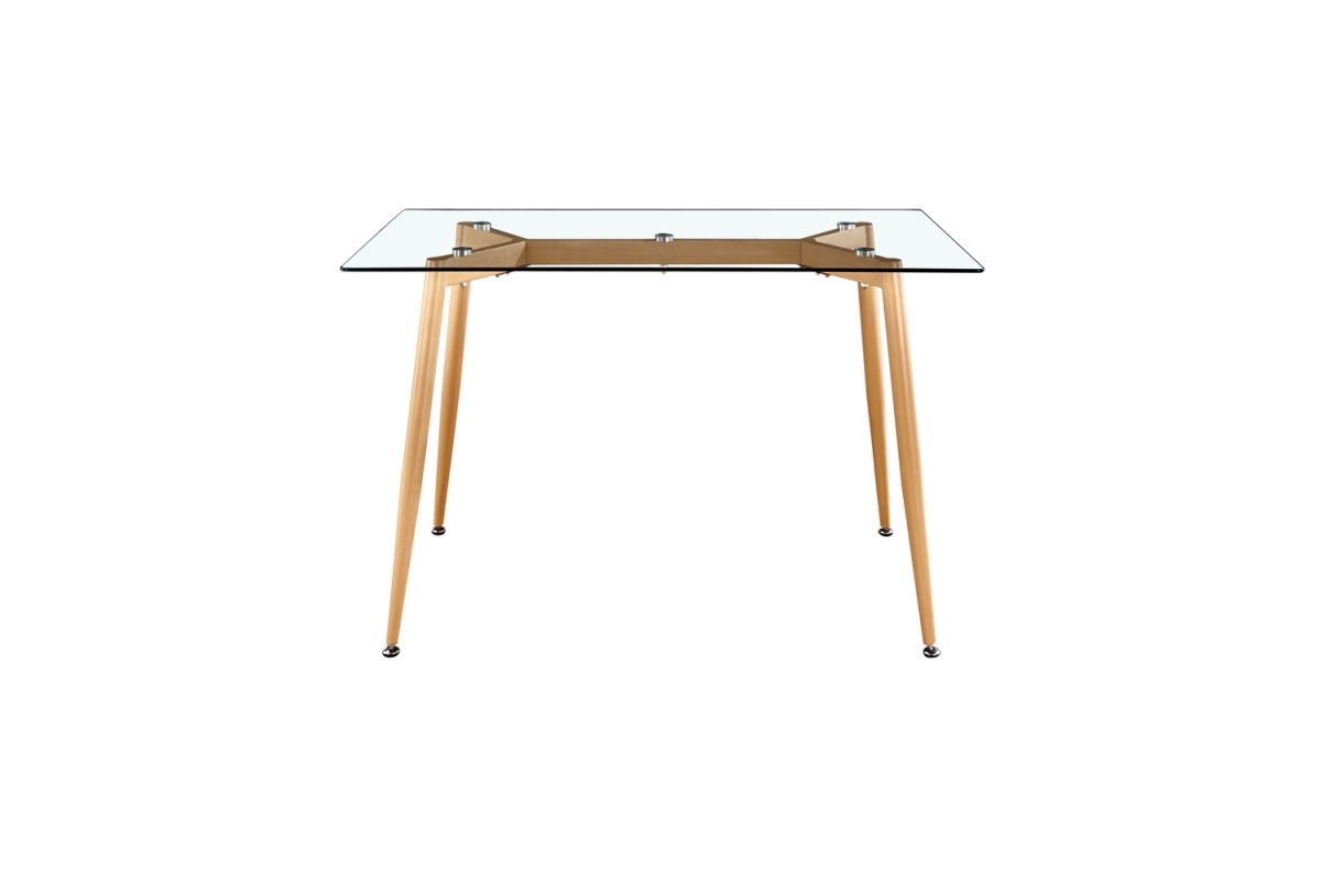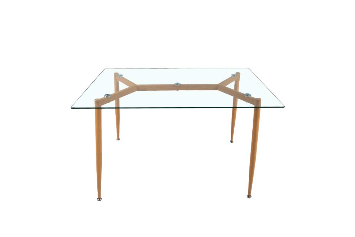 Стільниця: Скло прозоре, загартоване. Кріплення ніжок - металл товщина скла = 10 мм. Ніжки та каркас - термодрук стуктури деревини на металі. Висота: 75 см. Розмір стільниці: 120*80 см. Загартоване скло прозоре. Ніжки термодрук на металі стуктури деревини