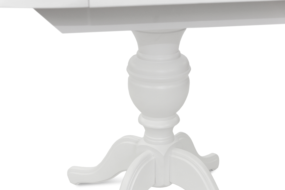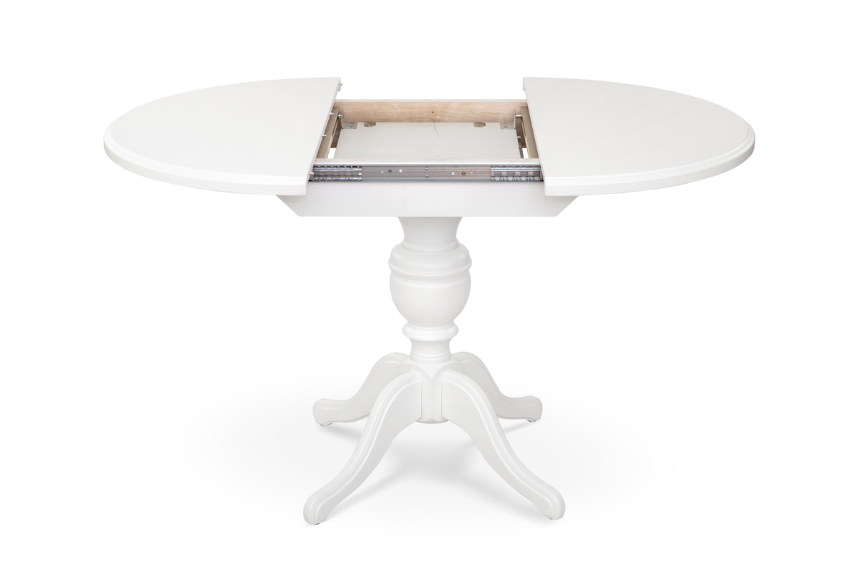 Розмір: D=89см, (+38см вкладка) Колір: Білий Матеріал: Каркас: масив сосни; Столешня: МДФ фарбований; Гермес – розсувний овальний стіл для вітальні з елегантною точеною ніжкою, виготовлений з натурального дерева. Торці столу гарно фрезеровані та пофарбовані. Столик виготовлений із масиву натурального дерева (каркас та ніжки). Натуральна деревина - це матеріал, який фактично позбавлений недоліків, тому що вона щільна, тверда, красива. Стільниця виготовлена з плити МДФ, покритої шпоном.