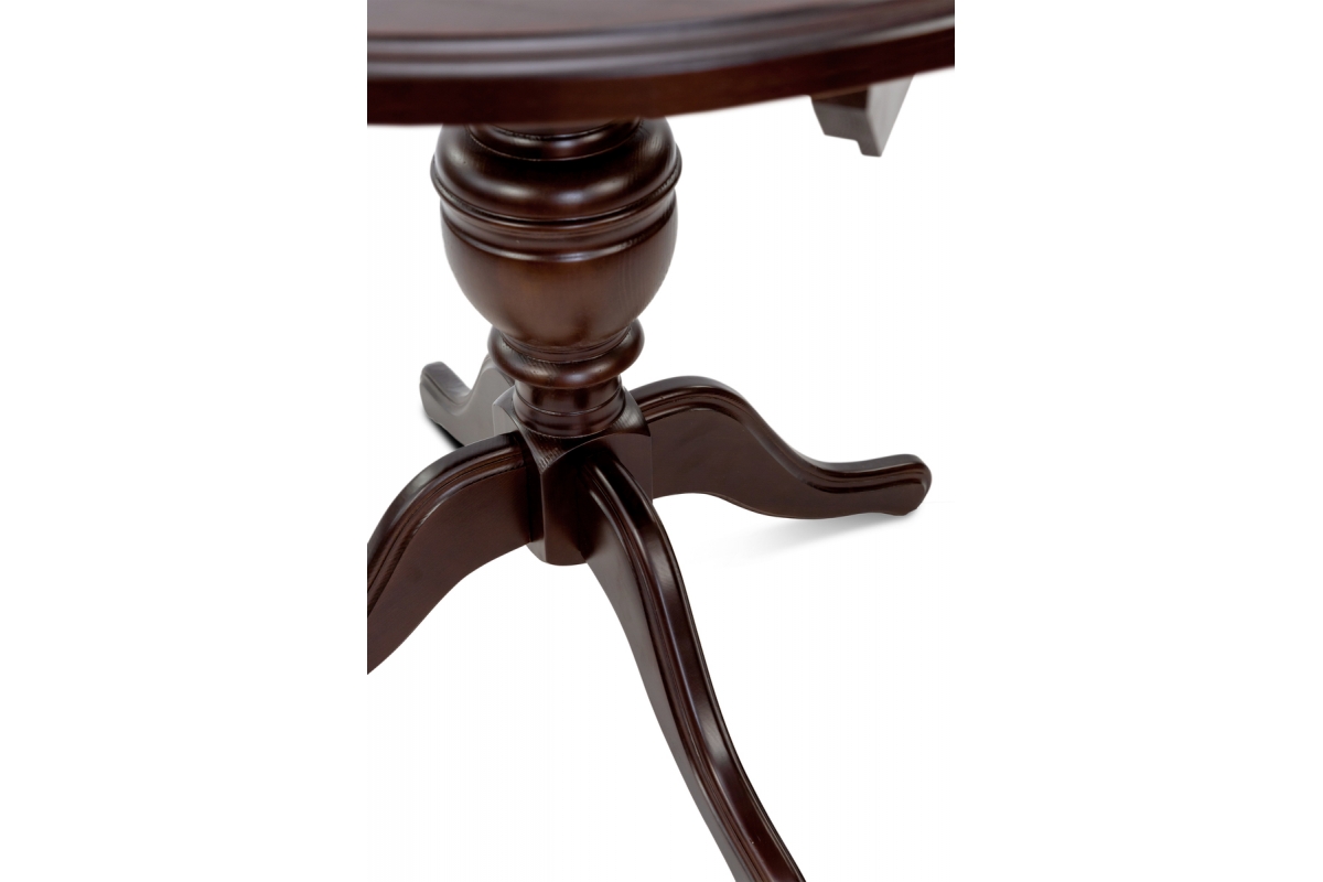 Розмір: D=89см, (+38см вкладка) Колір: Темний горіх Матеріал: Каркас: масив сосни; Столешня: МДФ фарбований; Гермес – розсувний овальний стіл для вітальні з елегантною точеною ніжкою, виготовлений з натурального дерева. Торці столу гарно фрезеровані та пофарбовані. Столик виготовлений із масиву натурального дерева (каркас та ніжки). Натуральна деревина - це матеріал, який фактично позбавлений недоліків, тому що вона щільна, тверда, красива. Стільниця виготовлена з плити МДФ, покритої шпоном.