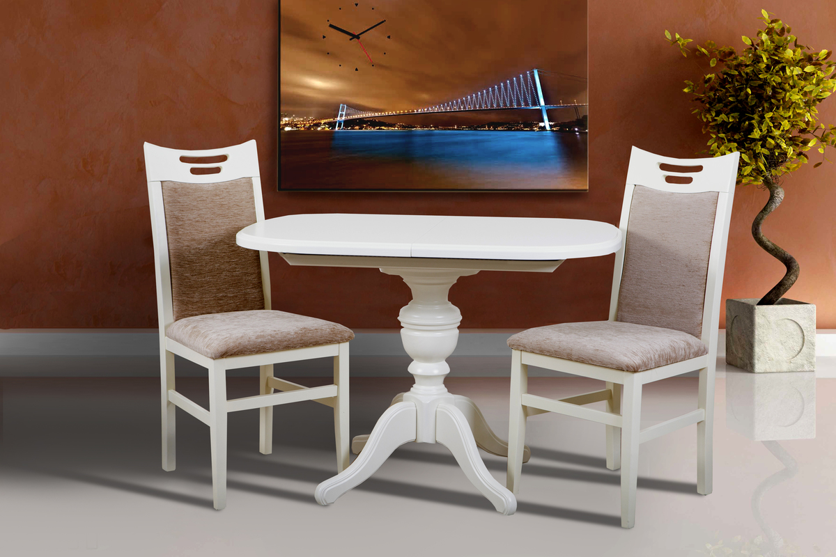 Розмір: 105(+40)*75 Колір: Білий Матеріал: Каркас і ніжки: Масив сосни; Столешня: Шпонований дубом МДФ Тріумф – розсувний овальний стіл для вітальні з елегантною точеною ніжкою, виготовлений з натурального дерева. Торці столу гарно фрезеровані та пофарбовані. Столик виготовлений із масиву натурального дерева (каркас та ніжки). Натуральна деревина - це матеріал, який фактично позбавлений недоліків, тому що вона щільна, тверда, красива. Стільниця виготовлена з плити МДФ, покритої шпоном.