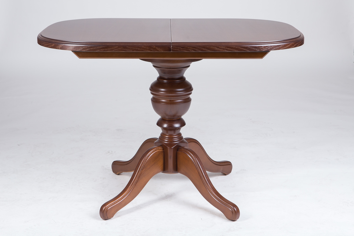 Розмір: 105(+40)*75 Колір: Горіх Матеріал: Каркас і ніжки: Масив сосни; Столешня: Шпонований дубом МДФ Тріумф – розсувний овальний стіл для вітальні з елегантною точеною ніжкою, виготовлений з натурального дерева. Торці столу гарно фрезеровані та пофарбовані. Столик виготовлений із масиву натурального дерева (каркас та ніжки). Натуральна деревина - це матеріал, який фактично позбавлений недоліків, тому що вона щільна, тверда, красива. Стільниця виготовлена з плити МДФ, покритої шпоном.