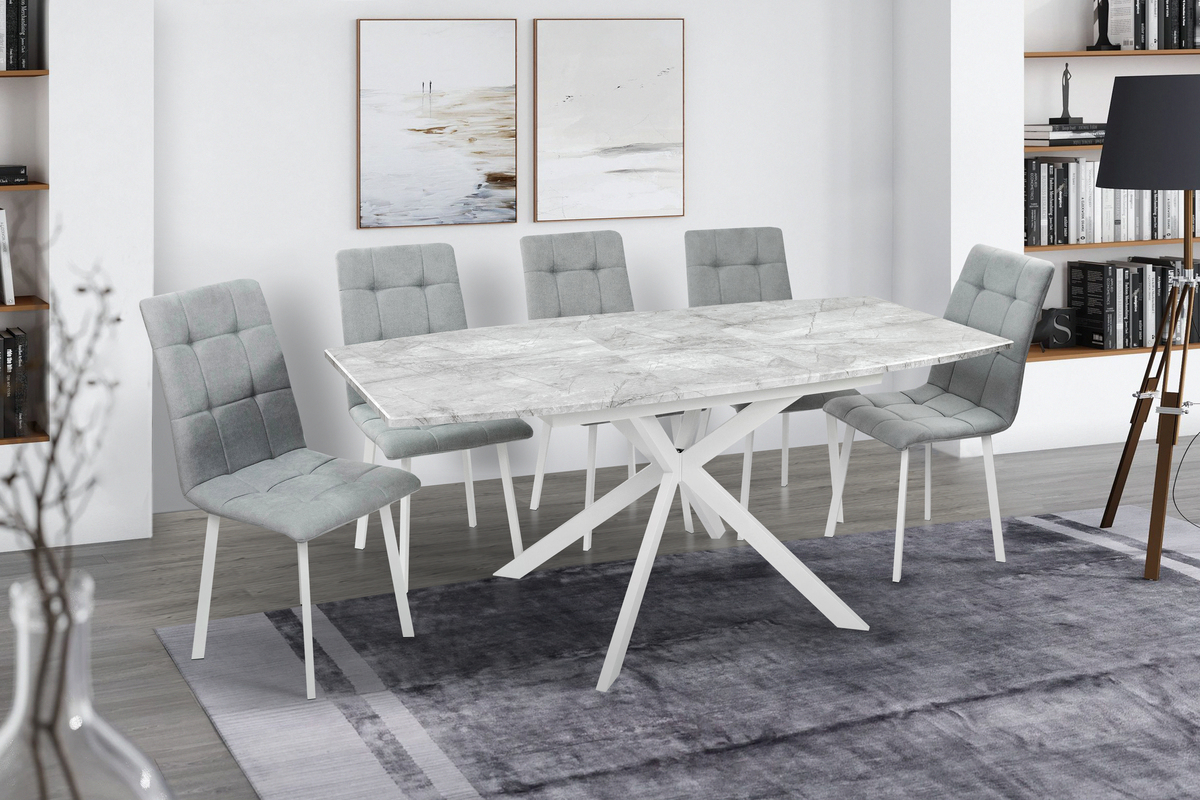 Розмір: 1400(+400)*850. Колір: Каркас і ніжки: Білий; Столешня: Базальт Матеріал: Каркас і ніжки: Метал; Столешня: МДФ у ПВХ плівці. Вкладка у стіл з механізмом "бабочка". Товщина столешні: 20 мм. Каркас і ніжки: порошкова покраска.